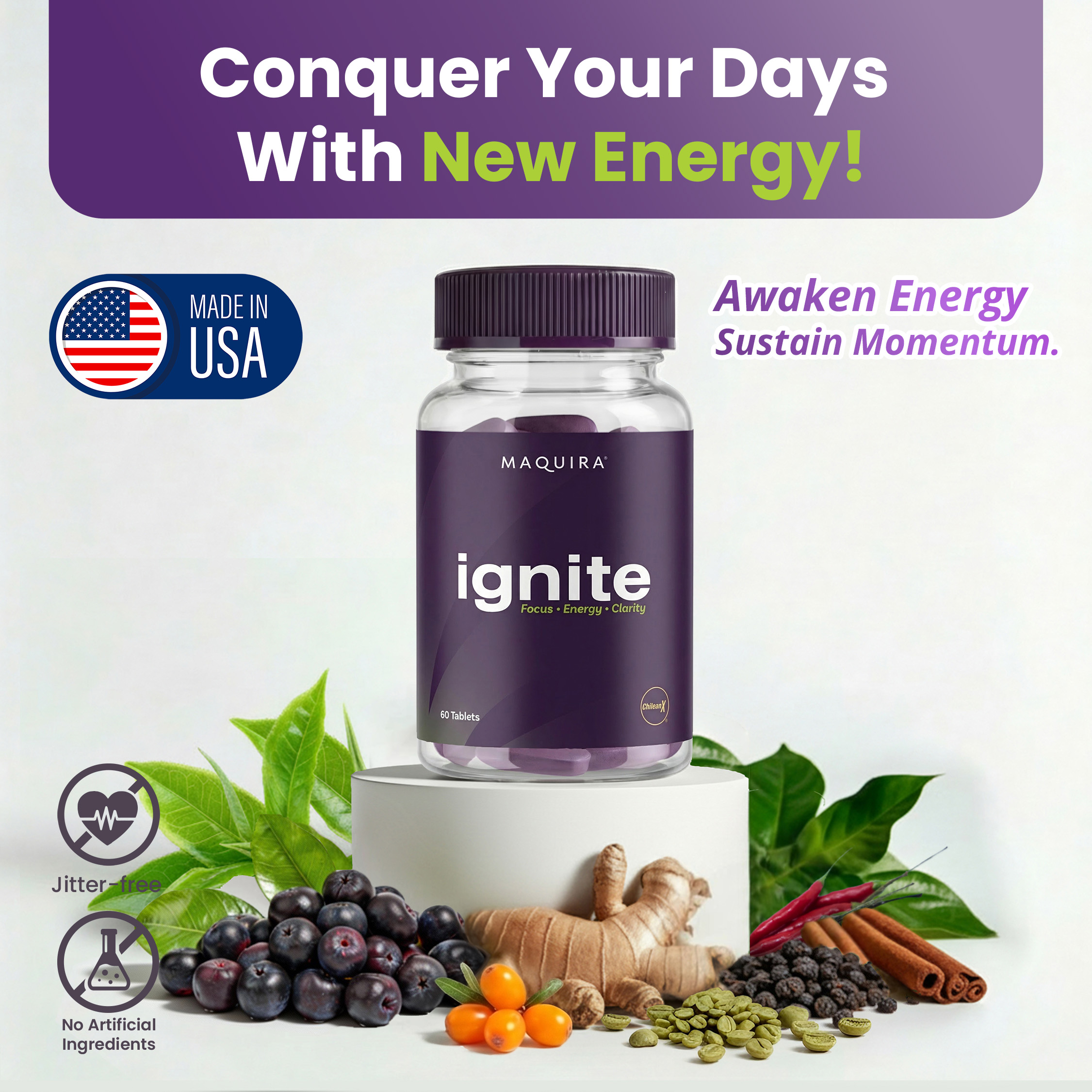 Maquira Ignite is a sophisticated expression of pure, natural energy—crafted for those who demand focus, endurance, and clarity without compromise. Powered by Maqui Berry and an advanced proprietary botanical blend, Ignite delivers clean, sustained vitality designed to support your day from early mornings to late-night momentum. No artificial stimulants. No sudden crashes. Only energy that moves with precision and purpose.