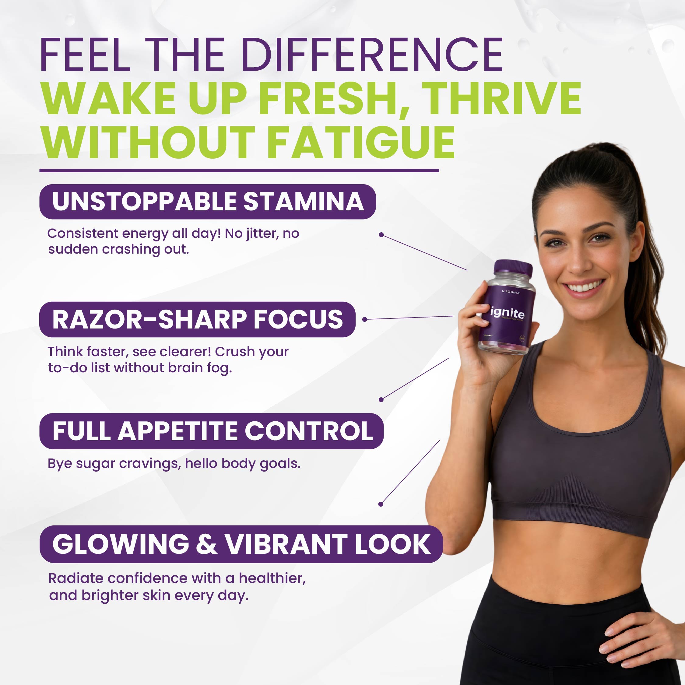 Maquira Ignite™ is powered by an advanced proprietary blend of nature-derived ingredients designed to support clean, all-day energy and mental clarity. Thoughtfully formulated to help enhance focus, support endurance, and gently curb sugar cravings—without overstimulation.