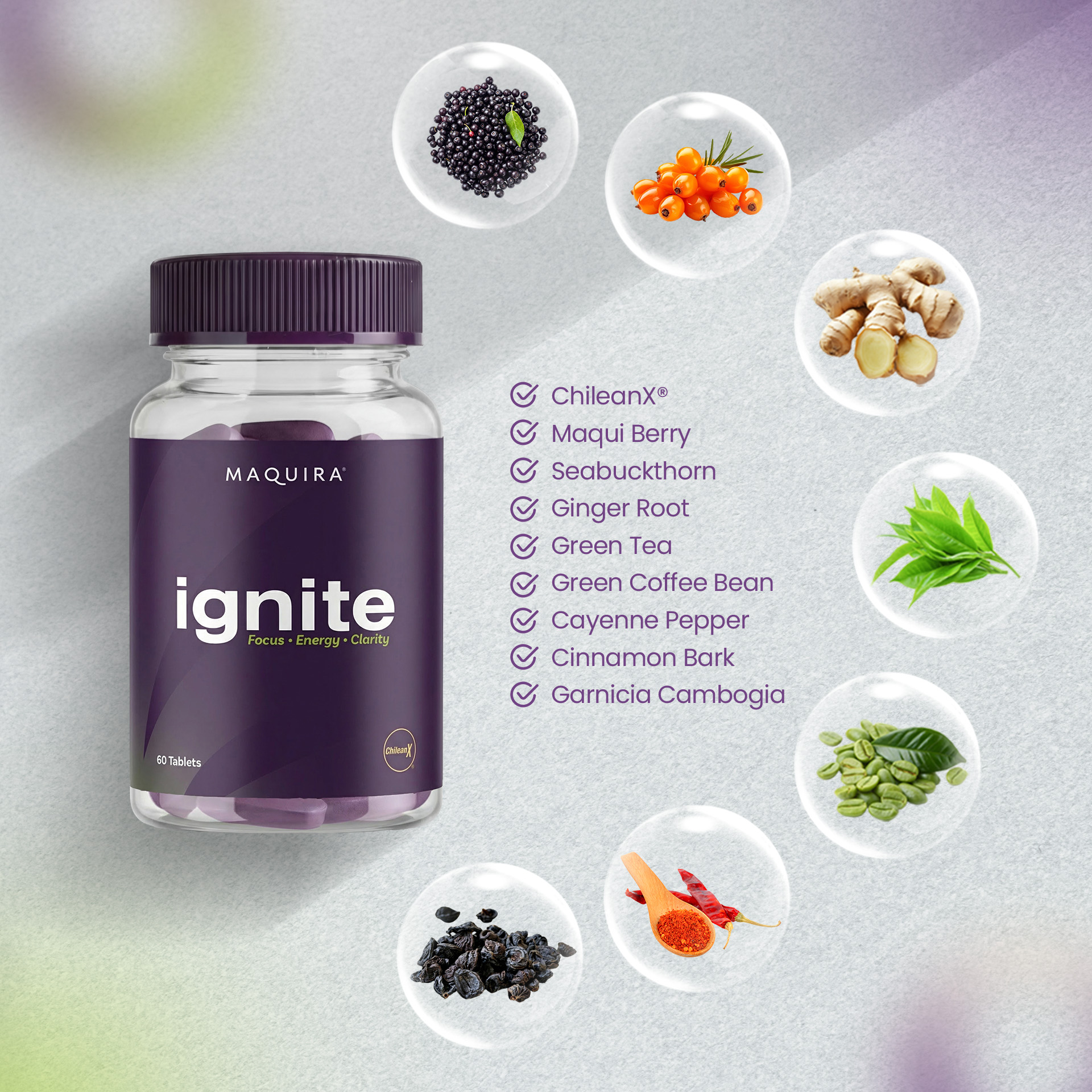 Maquira Ignite is formulated with a precisely curated blend of functional botanicals and essential micronutrients designed to support clean, sustained energy and mental clarity. At its core are Maqui Berry and ChilleanX, valued for their naturally occurring anthocyanins that support antioxidant balance. These are complemented by plant-based energy sources such as green tea and green coffee bean, alongside chromium to support normal metabolic function. Select botanicals—including ginger root, cinnamon bark, cayenne pepper, and garcinia cambogia—are included to complement circulation, appetite balance, and metabolic momentum. Each ingredient is chosen for synergy, bioavailability, and purpose, delivering energy that feels controlled, refined, and enduring—without artificial stimulants.